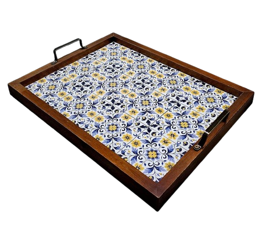 A bandeja de azulejo possui uma bela moldura em madeira maciça de cor natural e alças em ferro na cor tabaco. Seu estilo rústico é suavizado com os azulejos que dão um ar antigo e delicado para que possa ser colocado em ambientes dos mais variados estilos. São 12 azulejos em tamanho 9x9cm aplicados ao fundo da bandeja com diversas estampas para todos os estilos!