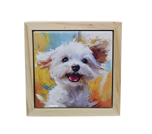 Com uma peça de azulejo impresso e emoldurado com madeira de pinus natural.