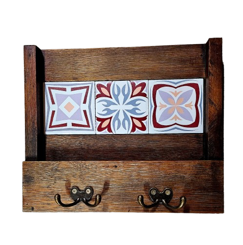 No centro, 3 azulejos cerâmicos com impressão digital conferem um ar de modernidade à peça. Além do aspecto decorativo, o porta chaves tem outras funcionalidades podendo ser utilizado para guardar celulares, escovas, carteira etc.