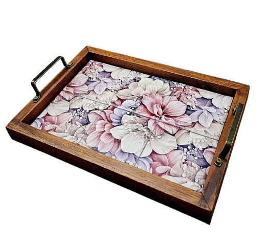 A bandeja de azulejo possui uma bela moldura em madeira maciça de cor natural e alças em ferro na cor tabaco. Seu estilo rústico é suavizado com os azulejos que dão um ar antigo e delicado para que possa ser colocado em ambientes dos mais variados estilos. São 12 azulejos em tamanho 9x9cm aplicados ao fundo da bandeja com diversas estampas para todos os estilos!